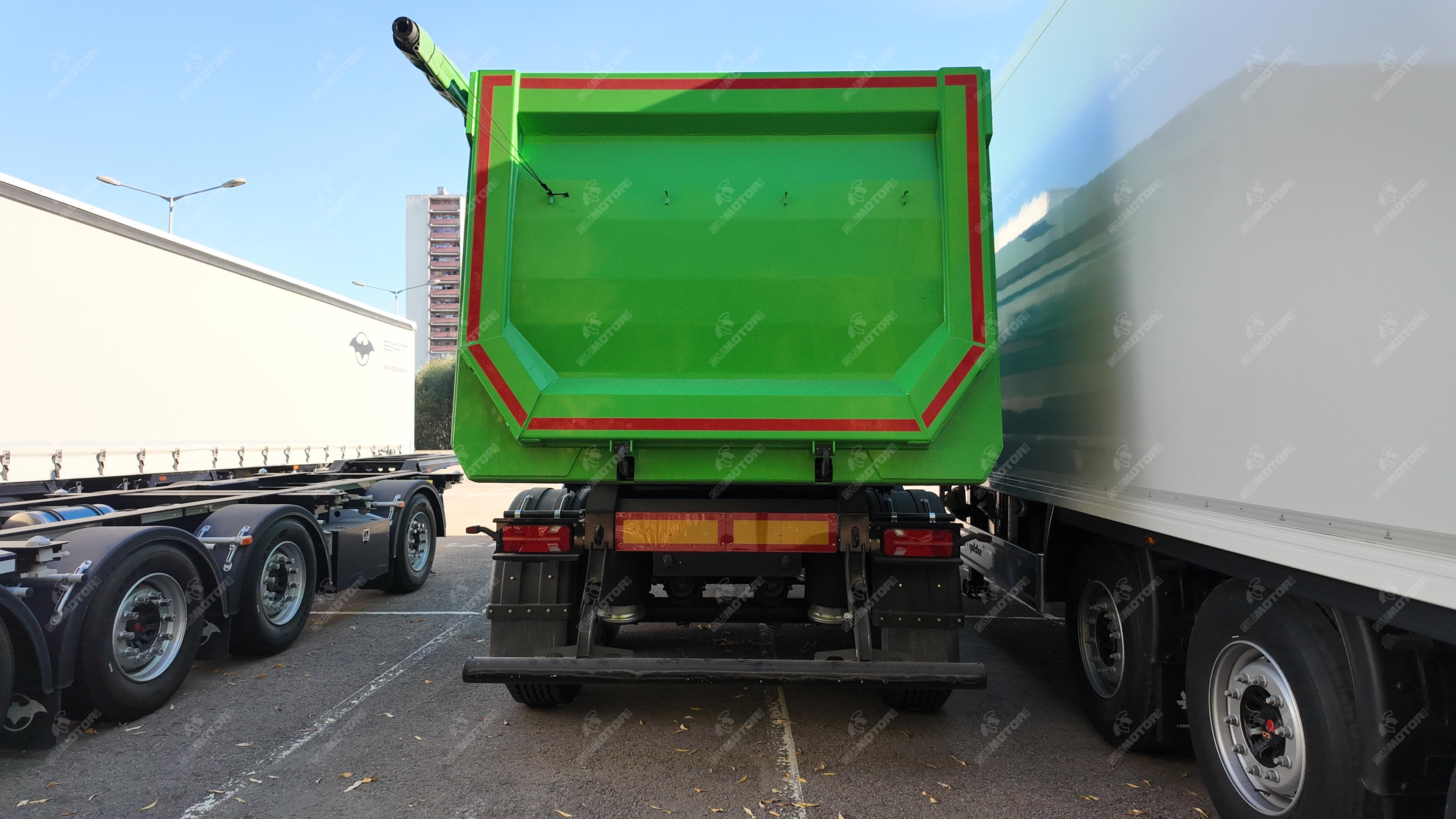 Оси с барабанными тормозами SAF12т, EBS. Ящик для инструмента. Кронштейн для запасного колеса. Запасное колесо, стальные диски. Подъемная ось. Гидравлический цилиндр Junton.